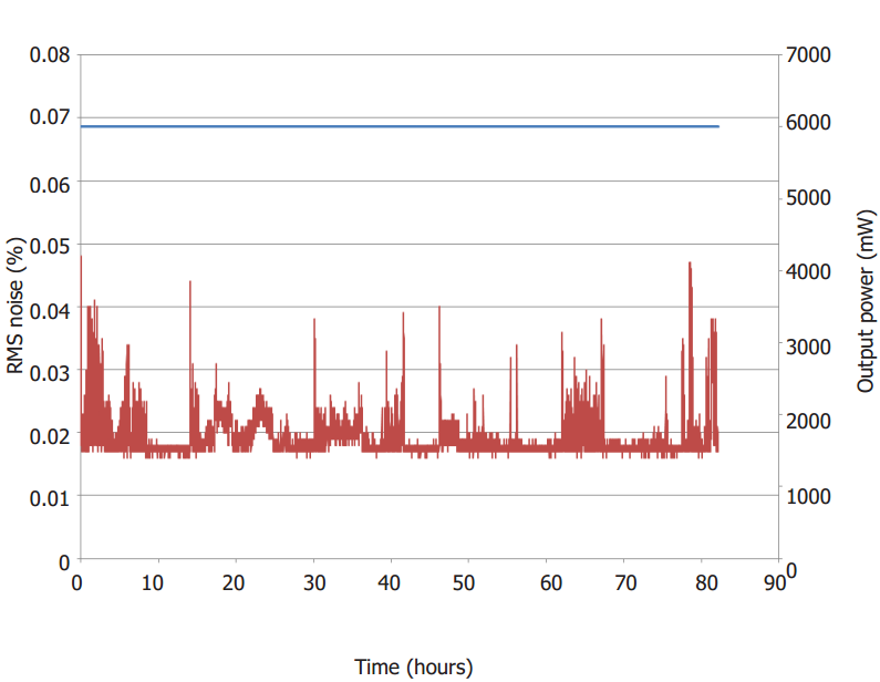 典型 opus 532 噪聲(紅色)和功率穩(wěn)定性(藍(lán)色)測試結(jié)果顯示噪聲性能遠(yuǎn)低于規(guī)范,并且在 >80 小時(shí)的測試中具有超穩(wěn)定的功率輸出