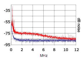 Torus 激光(藍線)和SLM激光(紅線)的光譜噪音比較