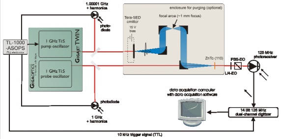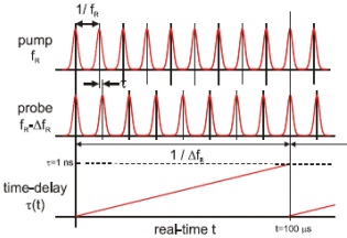 HASSP-THz采用同步高速光學(xué)采用(ASOPS)原理。高速ASOPA可以同時(shí)實(shí)現(xiàn)高掃頻速度和高頻率分辨。這在傳統(tǒng)單飛秒振蕩器加機(jī)械掃描延遲線的時(shí)域測(cè)量系統(tǒng)是不可能實(shí)現(xiàn)的。高速ASOPS用兩臺(tái)獨(dú)立的1GHz重復(fù)頻率的飛秒振蕩器分別作為泵浦光和探測(cè)光。給這兩個(gè)脈沖存設(shè)定微小的頻率頻率差△fR =10KHz(對(duì)GaP 為2KHz),則泵浦光和探測(cè)光△fR相位差在0-1ns(對(duì)應(yīng)1GHz)內(nèi)自動(dòng)高速相位掃描,掃描頻率為10KHz在此機(jī)械式掃描延遲線不再需要了。