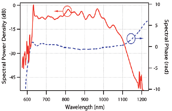 藍(lán)色線為使用SPIDER后的光譜相位補(bǔ)償,紅色線為激光器系統(tǒng)實(shí)測的帶寬輸出光譜。 |