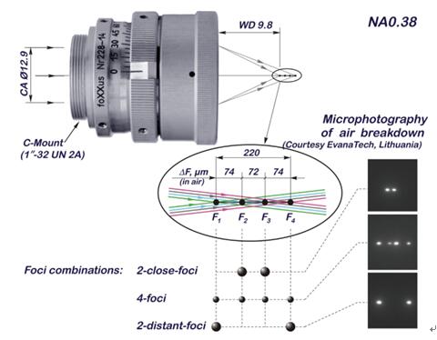 具有專(zhuān)利設(shè)計(jì)的能產(chǎn)生多焦點(diǎn)的物鏡。foXXus物鏡可以在一條光軸上產(chǎn)生1,2或者4個(gè)焦點(diǎn)。其中0.07-0.22表示在空氣中的DF(mm),NA0.38代表數(shù)值孔徑。材料內(nèi)部裂紋通常比光學(xué)設(shè)計(jì)中定義的DF更長(zhǎng)。